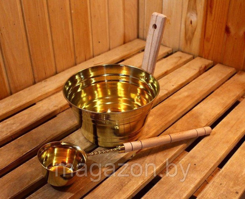 Ушат и черпак изготовлены полностью из чистой 100% латуни, рукоятки - дерево.
