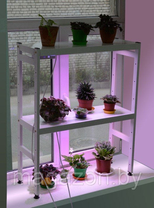 Металлическая разборная с 2-мя полками. Поставляется в комплекте с 2-мя фитолампами для рассады LED-15, которые крепятся к каждой из полок. Фитолампы имеют специально подобранный спектр излучения, который благотворно влияет на рост и развитие растений.