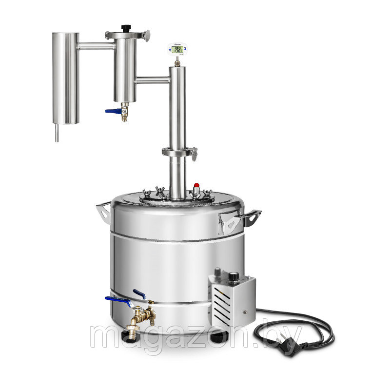 Дно перегонного куба – ферромагнитное. Подходит для газовых, индукционных и электрических плит. Модели от 20-ти литров могут быть оснащены встроенным ТЭНом.